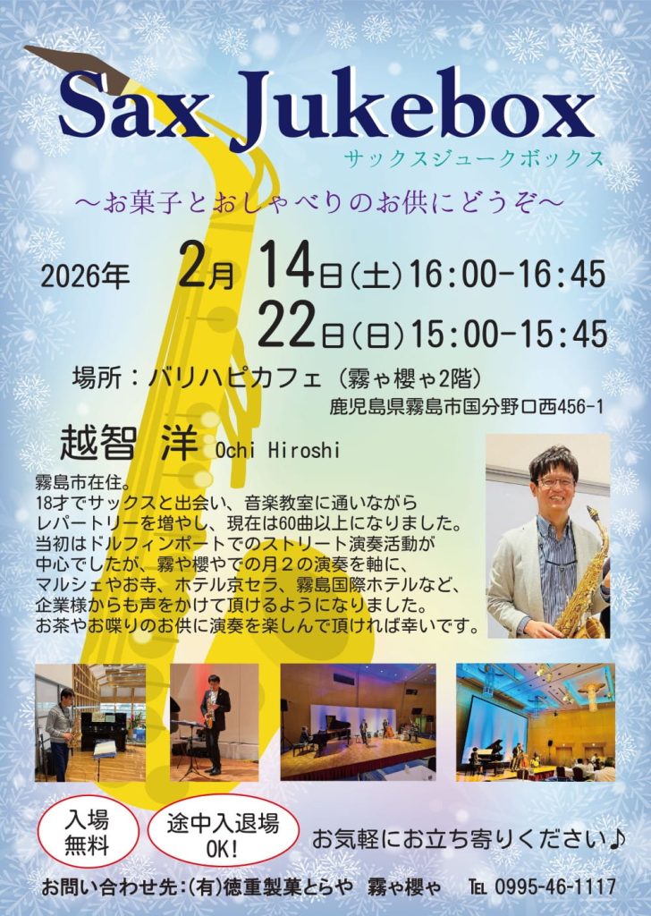 霧島市内外で活躍されているお二人が毎月1回、観覧無料にてコンサートを開催いたします。