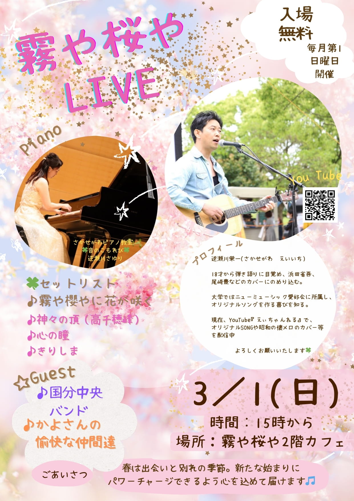 霧島市を拠点にストリート演奏を中心に活動しており、霧や櫻やでは毎月2回観覧無料にてコンサートを開催しています。