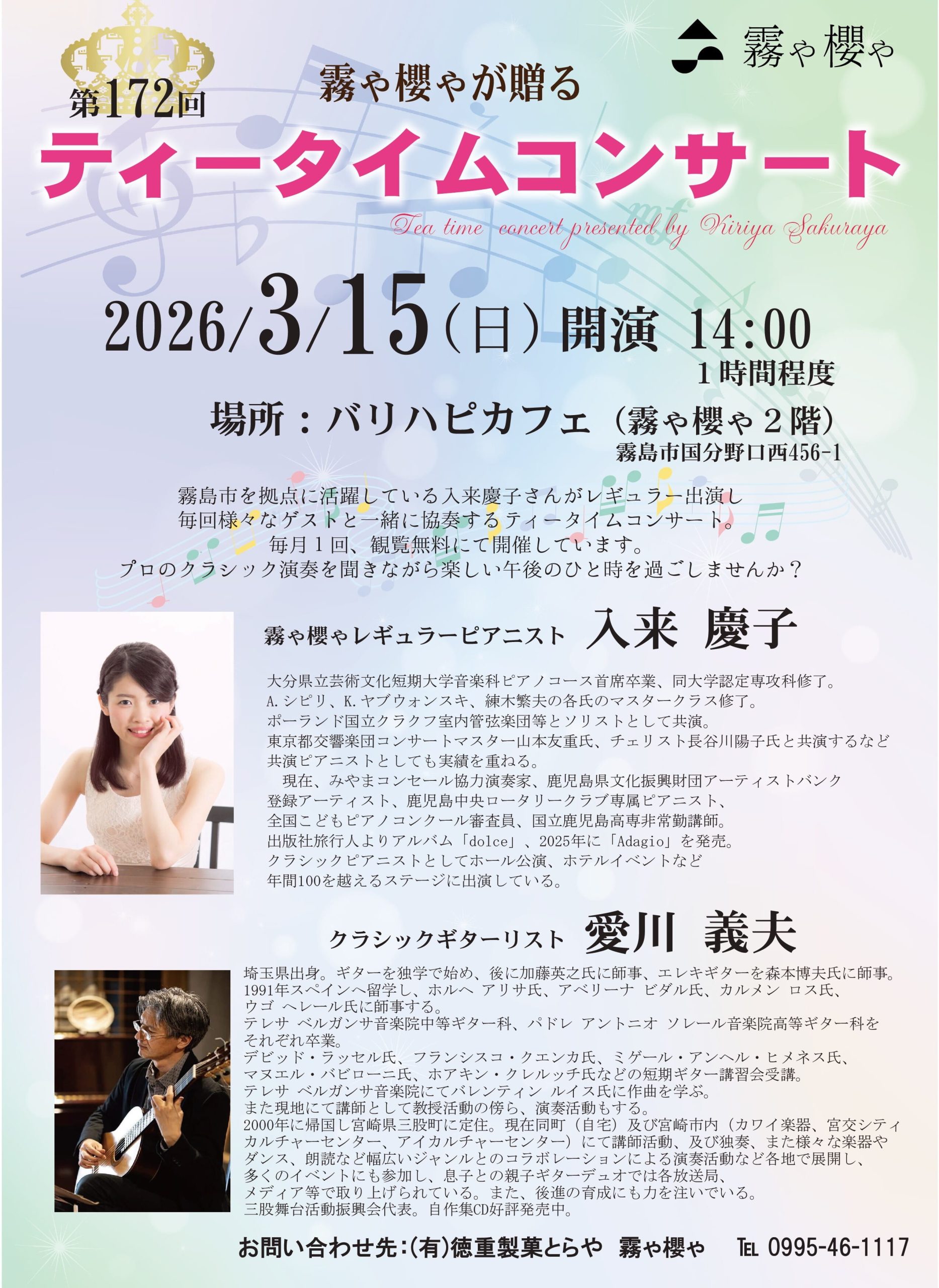 霧島市内外で活躍されているお二人が毎月1回、観覧無料にてコンサートを開催いたします。