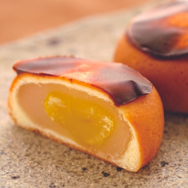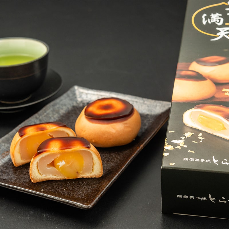 極大粒の栗を丸ごと白餡に包み、さらに生地に包んで焼き上げたあと表面に黒砂糖風味の羊かんをあしらった贅沢の限りを尽くした栗饅頭でございます。